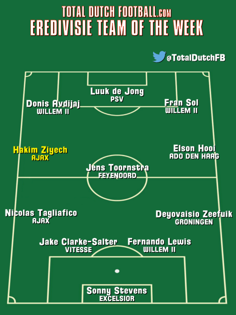 Luuk de Jong snatched his first two goals of the season in a last gasp 2-1 win over PEC Zwolle. Three Willem II players made the team. Fernando Lewis, Donis Avdijaj and Fran Sol were the pick of the team that thumped Heracles by five goals to nil.